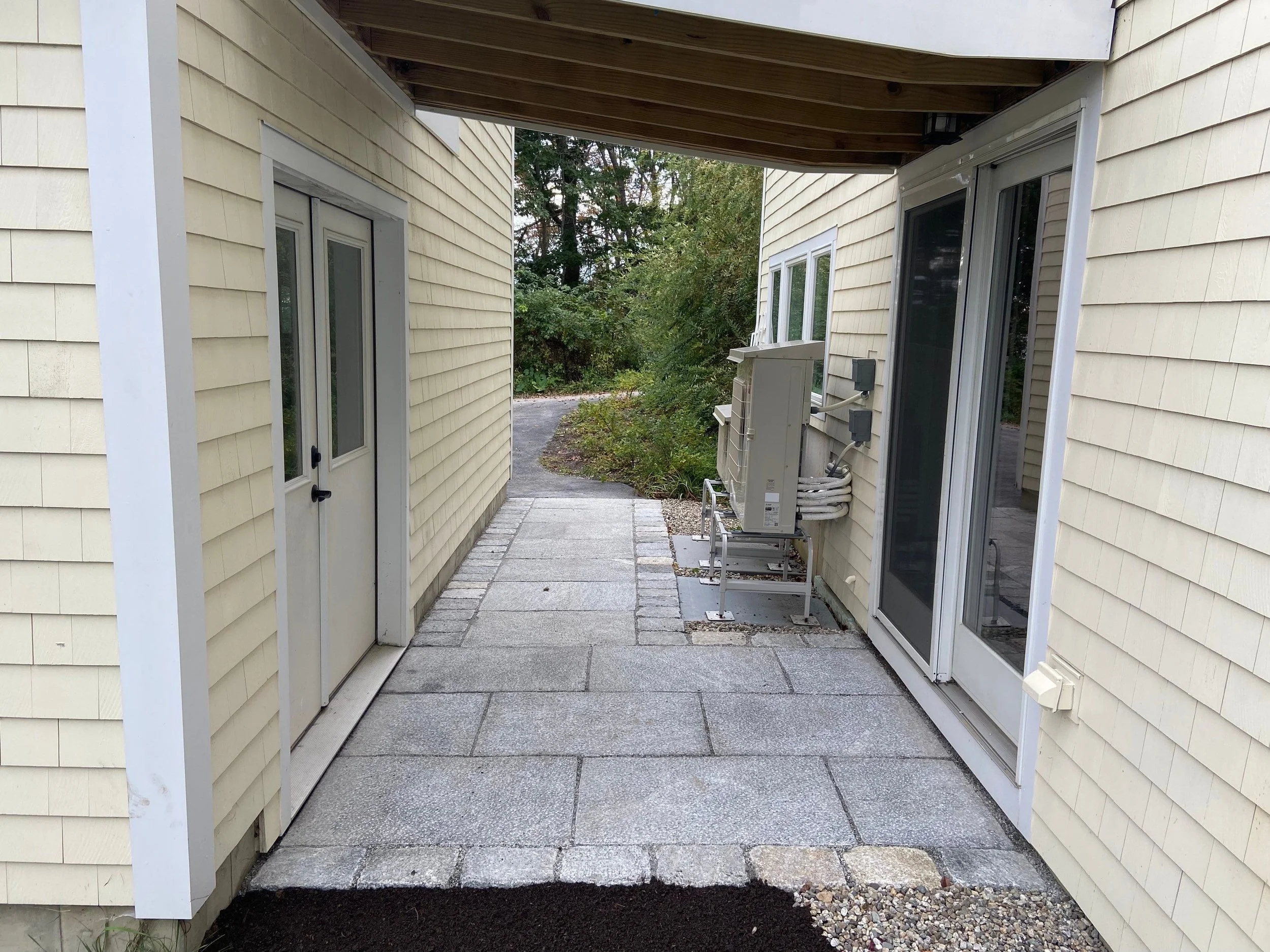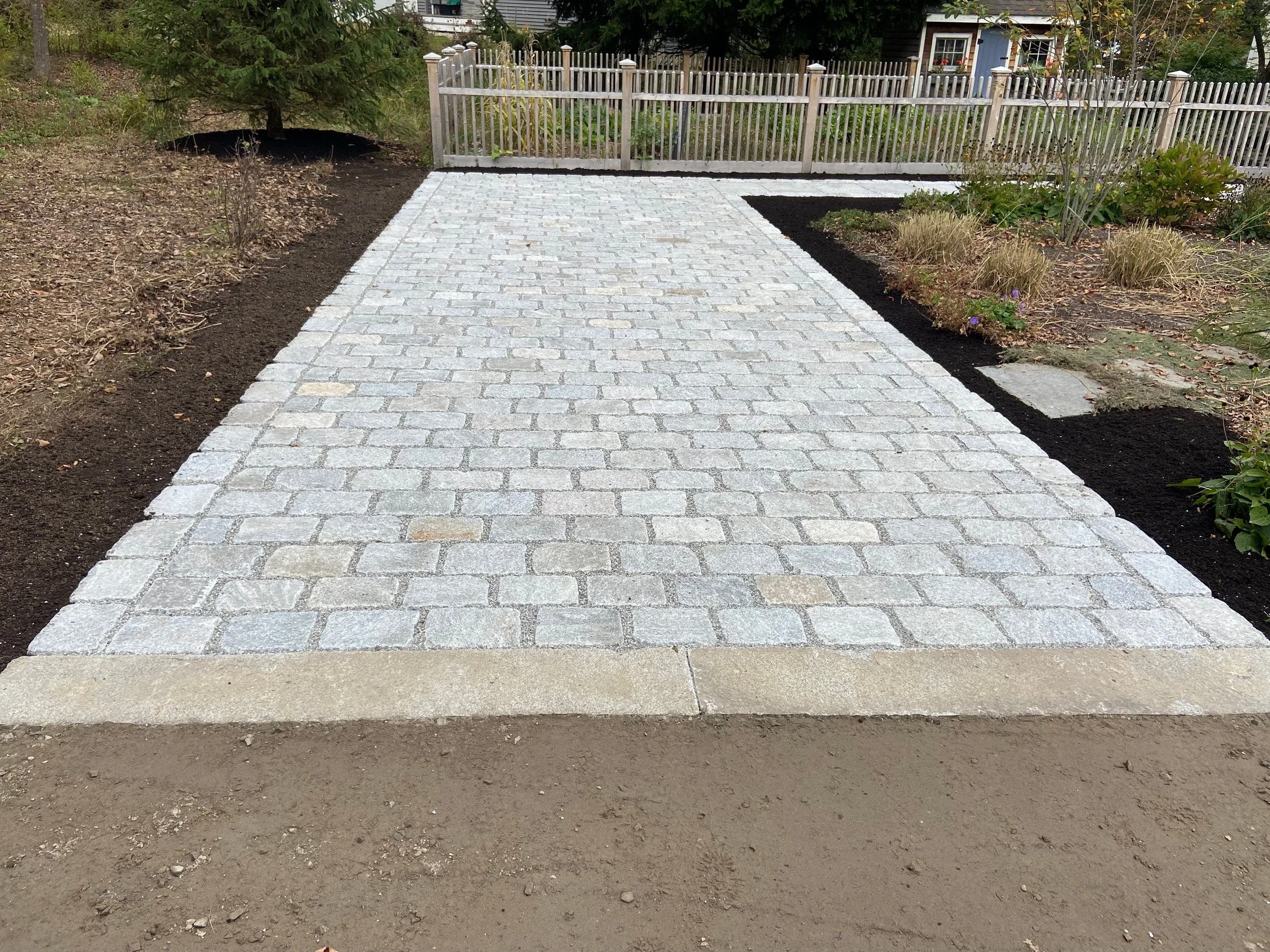 The cobblestone driveway, with an apron using reclaimed curbing sourced from a nearby bridge project, was a major element of this project