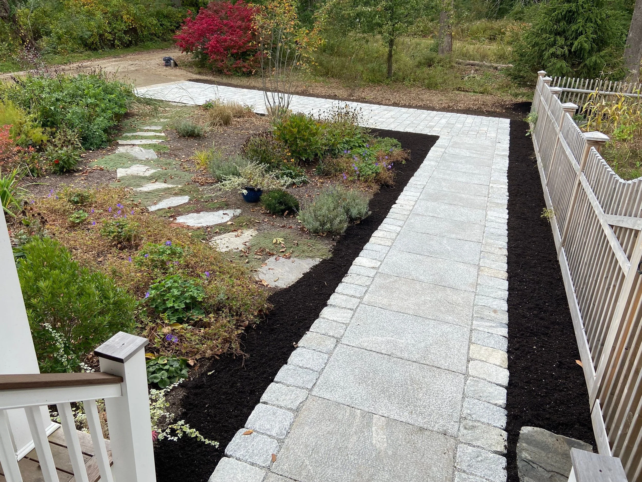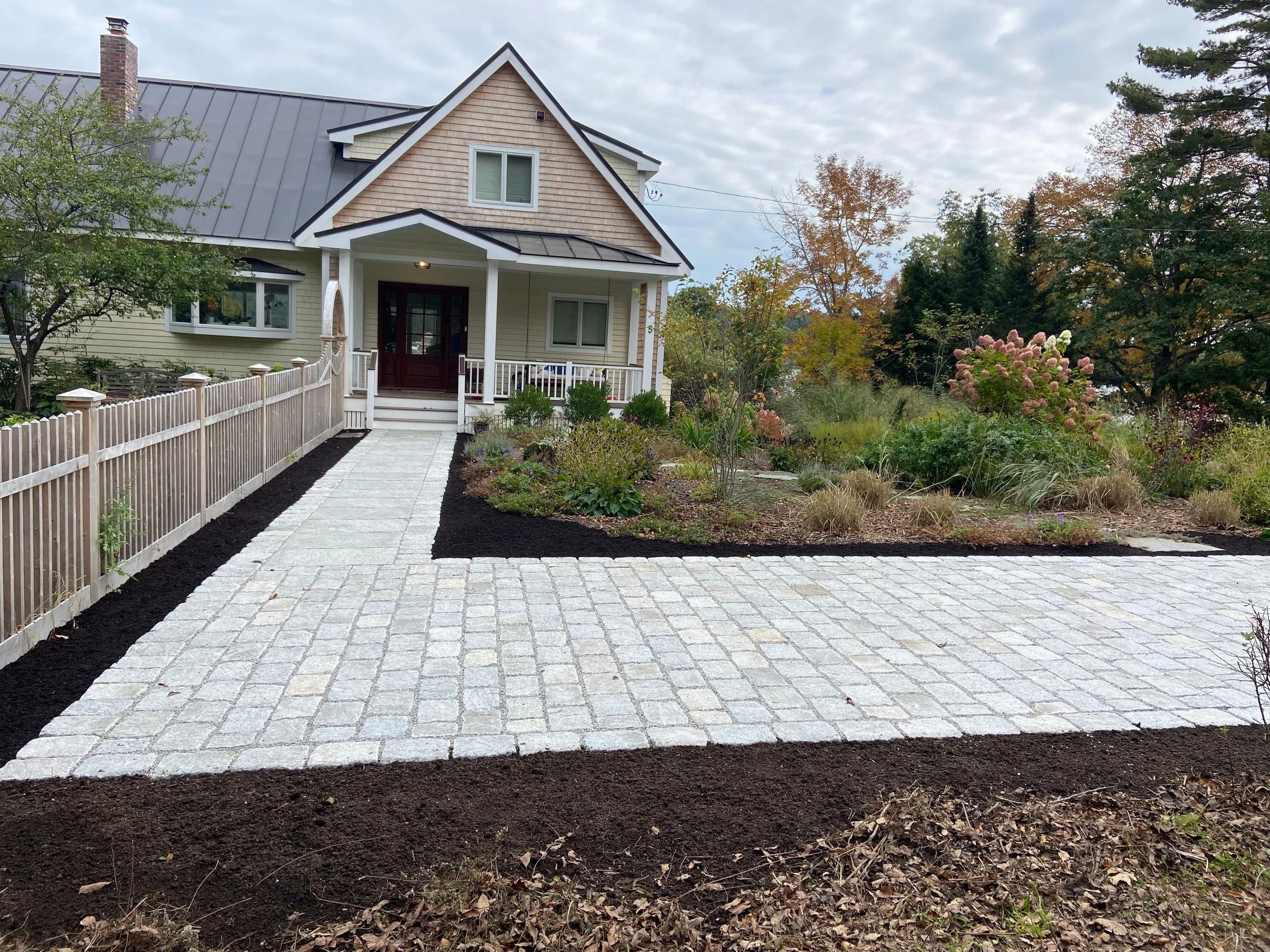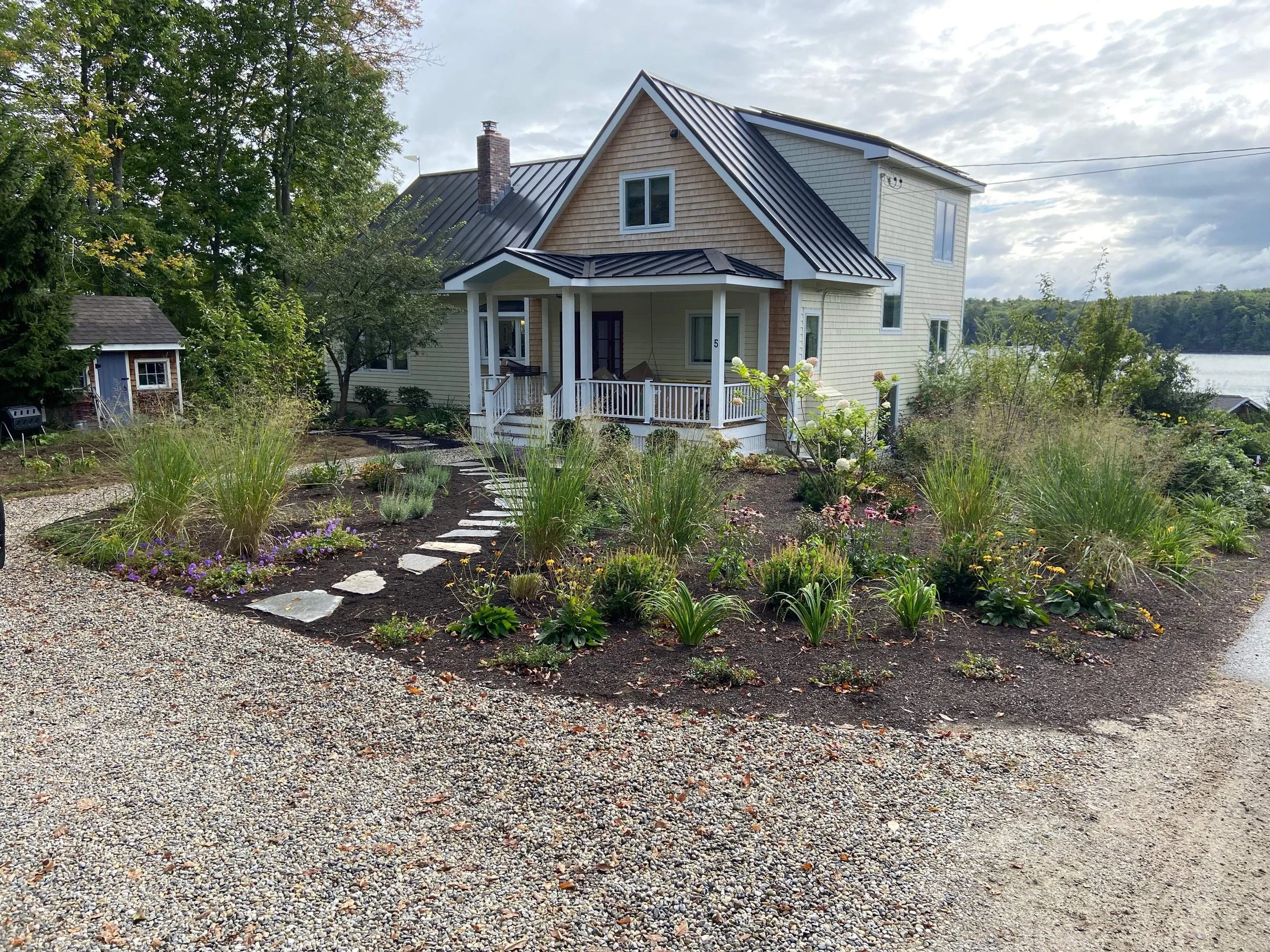 This project was done in phases over the course of several years, slowly building on the vision of the owner, Tree and Stone, and Julia Libby of Pollen. Features include a cobblestone driveway, granite walkways, stepping stone paths through the extensive gardens, no-mow lawn, and numerous plantings. Addressing steep slopes and stormwater drainage with a natural aesthetic were important considerations due to the picturesque location on the banks of the Harraseekat River in Freeport.