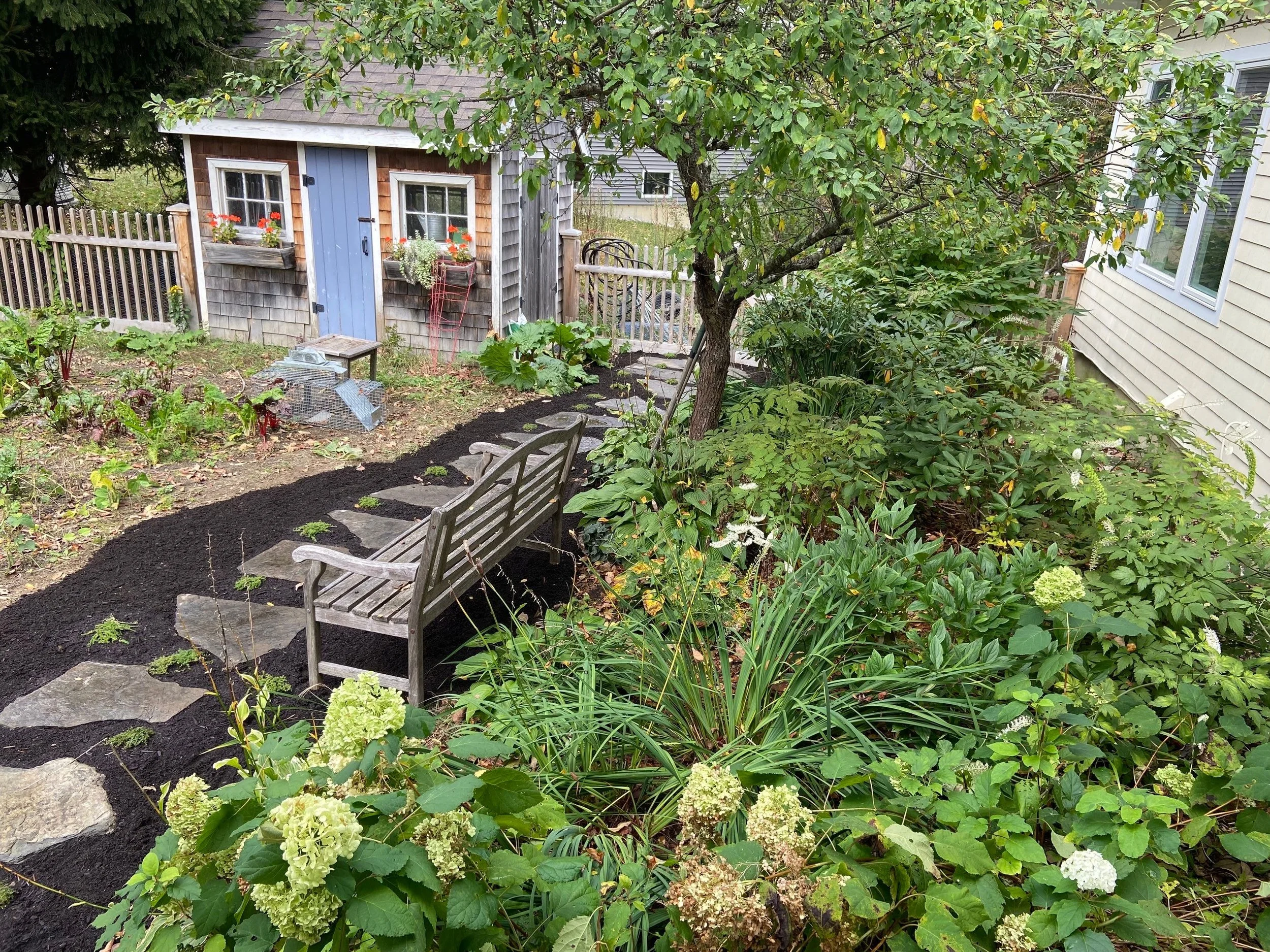 A stepping stone path meanders between a dense foundation bed and the vegetable garden
