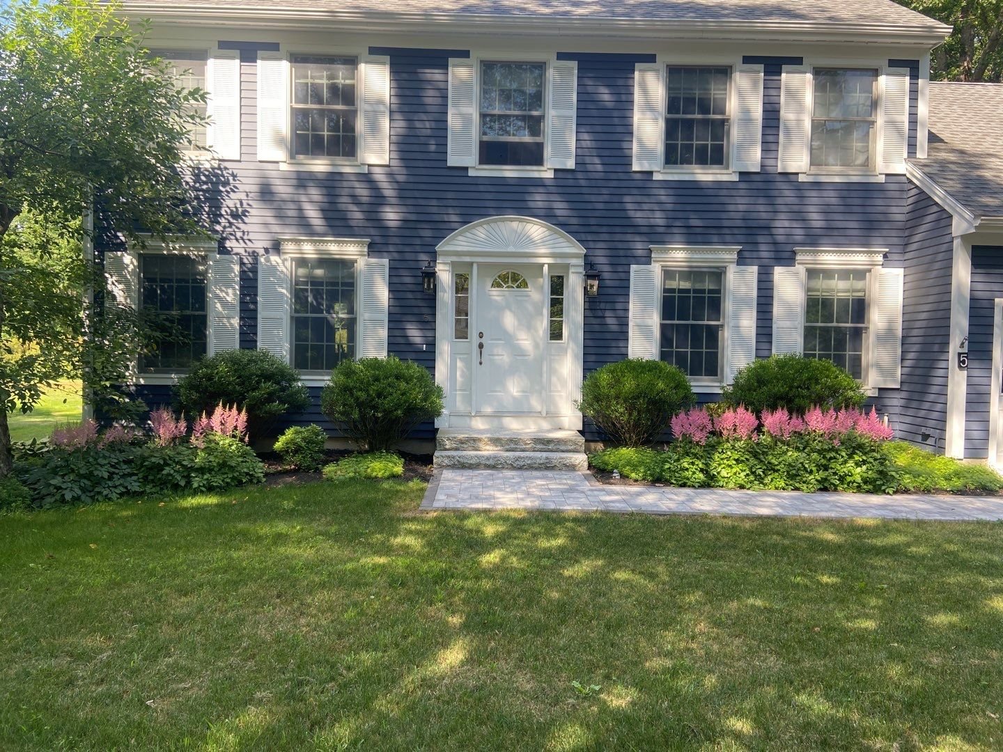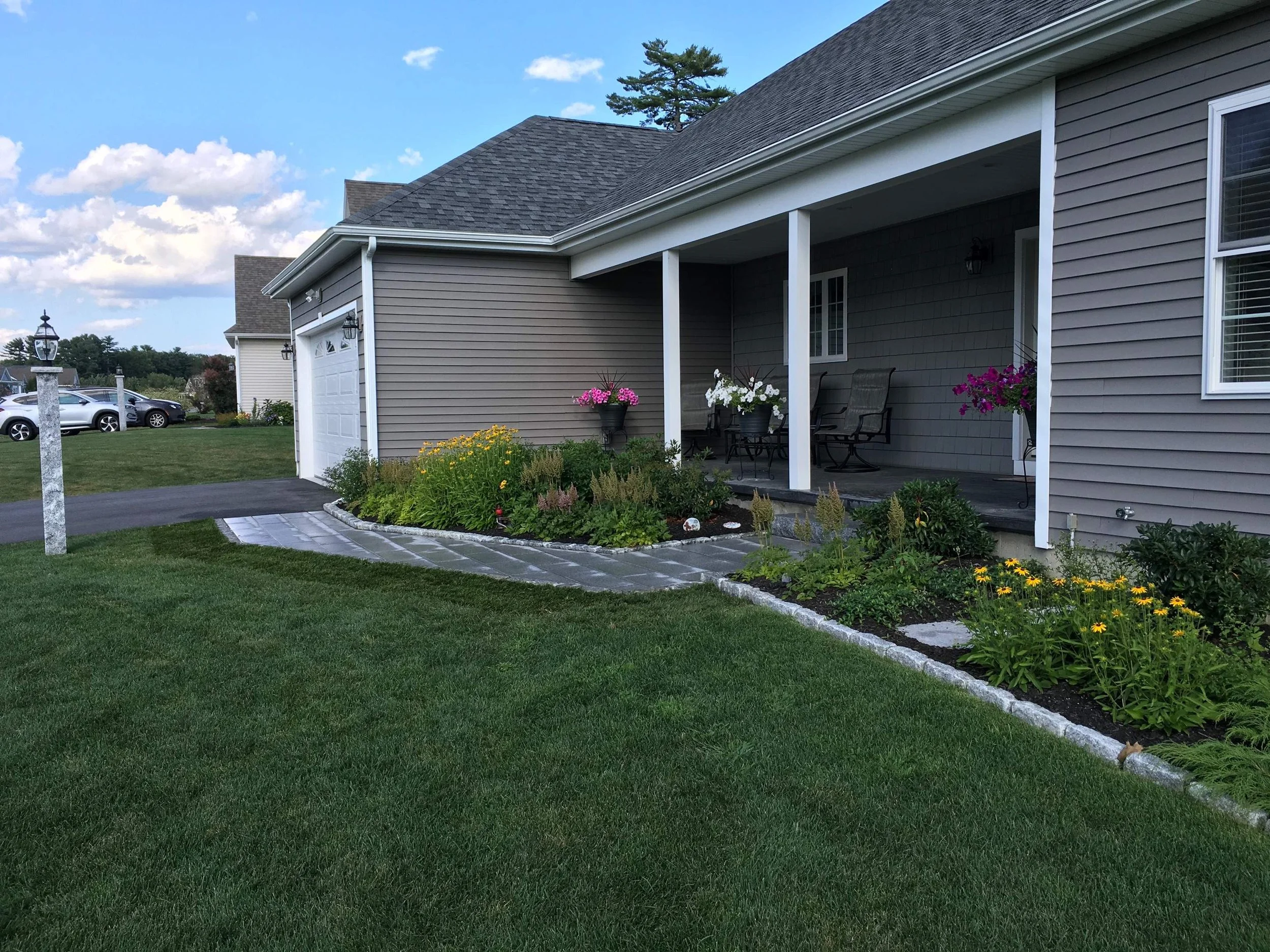 Vibrant beds brighten this entry in Old Orchard